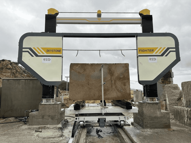 The Monowire WB-4000B is a precision cutting machine featuring a robust structure with a top beam, vertical columns, and large flywheels. It uses a hydraulic tensioner to adjust the diamond wire’s tension and can cut various materials at speeds up to 40 m/s, controlled by an inverter.
